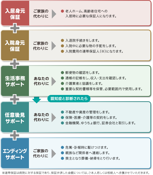 高齢者住宅や老人ホームに入居する際には、身元保証人が必要です。しかし「子供がいない…」「兄弟とは疎遠で…」「親戚には頼りたくないし…」そんな方の身元保証人になり、財産の管理やエンディングまでお守りするプランです。